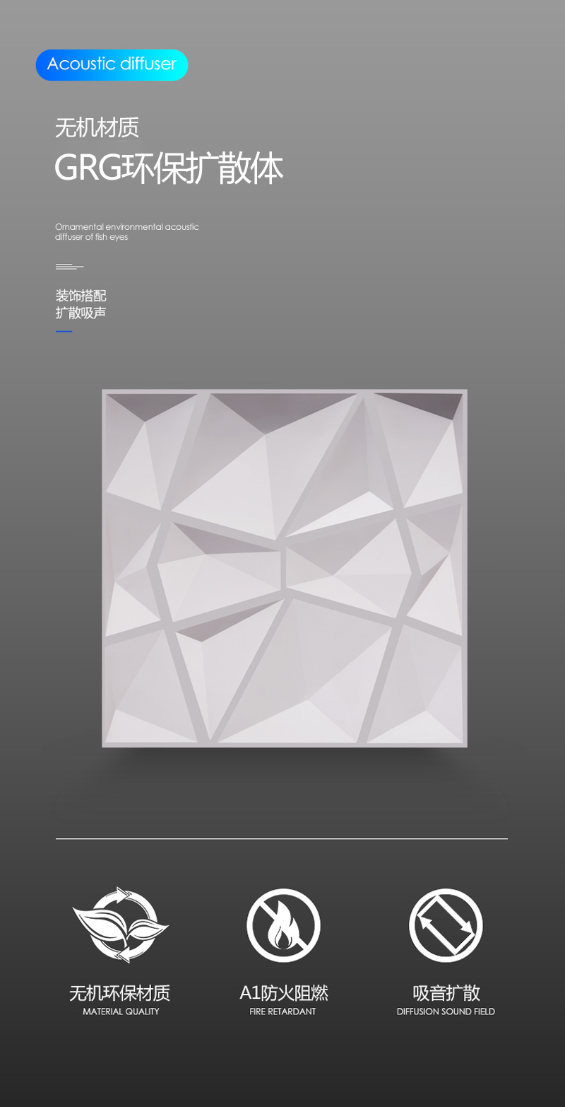 8、聲學效果好:檢測表明:4mm厚的G.R.G.材料,透過損失500Hz23dB、100Hz27dB;氣干比重1.88符合專業(yè)聲學反射要求。經(jīng)過良好的造型設計,可構成良好的吸聲結構,達到隔聲、吸音的作用。 間僅需30分鐘,干燥時間僅需4個小時。因此能大大縮短施工周期。
